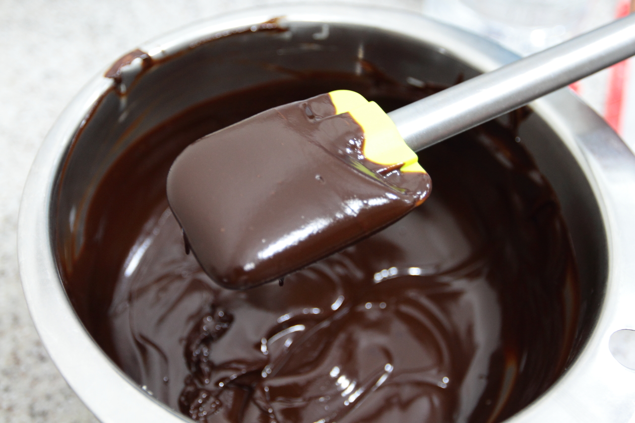 딱딱한 초콜릿에 뜨거운 생크림을 부으니까 초콜릿이 녹기 시작한다.