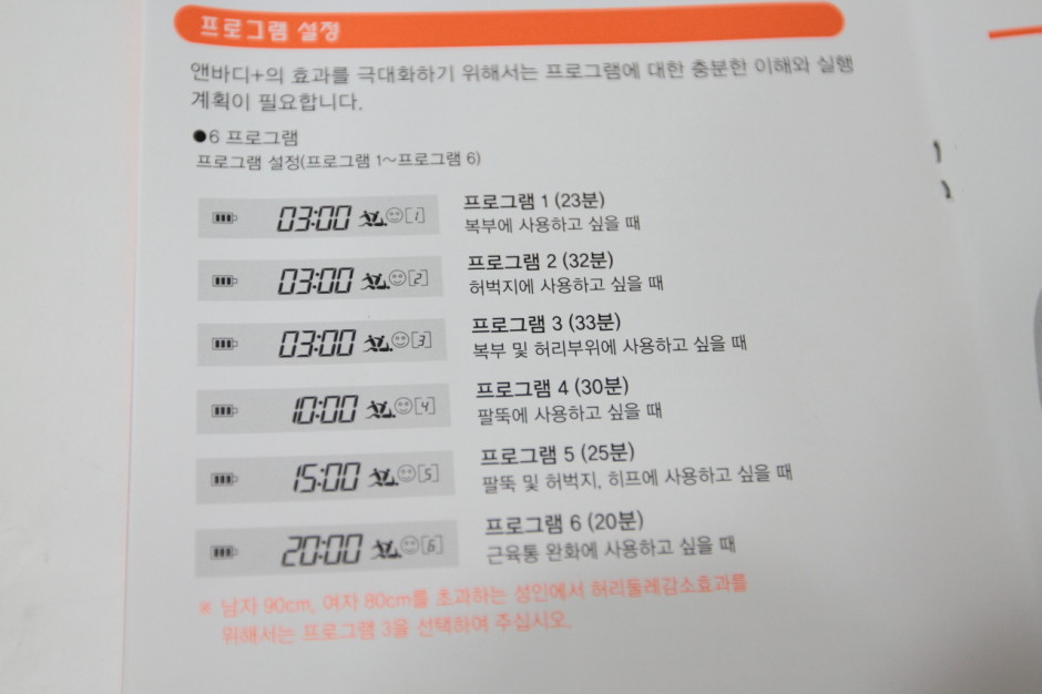 앤바디플러스는 총 6개의 모드를 사용할 수 있다고 하는데, 각 프로그램모드에 대한 설명이 잘 적혀있다.