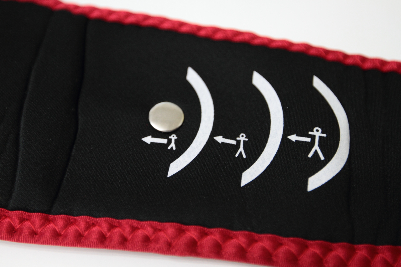 까만색 천에 빨간색 테두리로 만들어진 앤바디플러스 벨트.