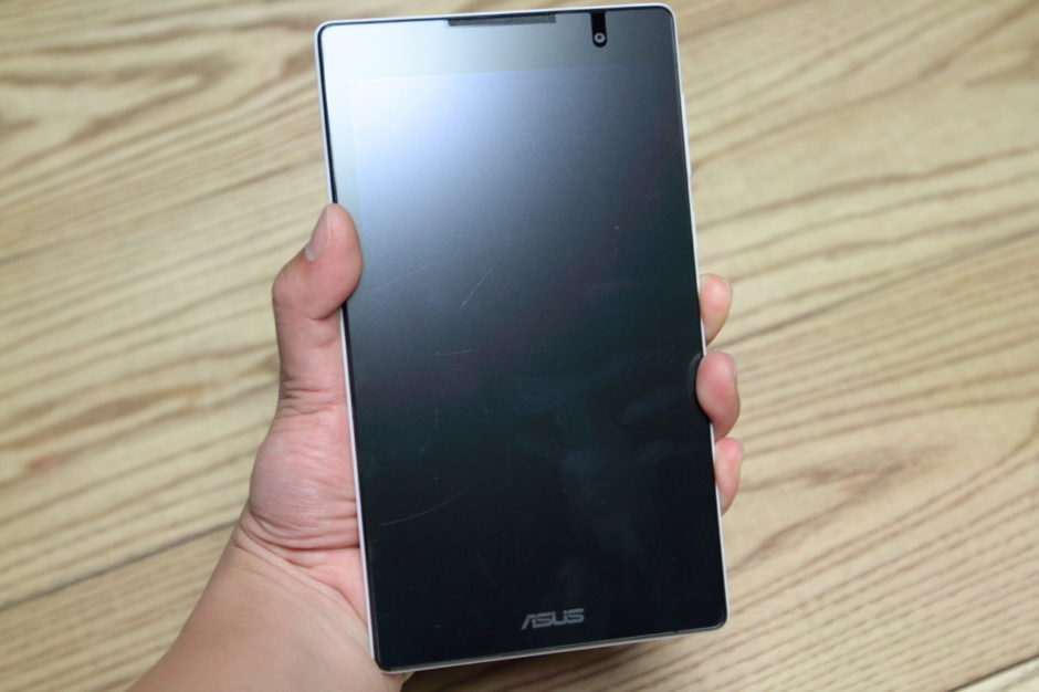 먼저 젠패드S 8.0을 한 손으로 잡아본 모습.