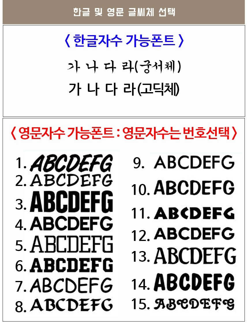 리얼커스텀캡에서 모자제작을 의뢰할 때 선택할 수 있는 폰트는 위의 리스트와 같다.