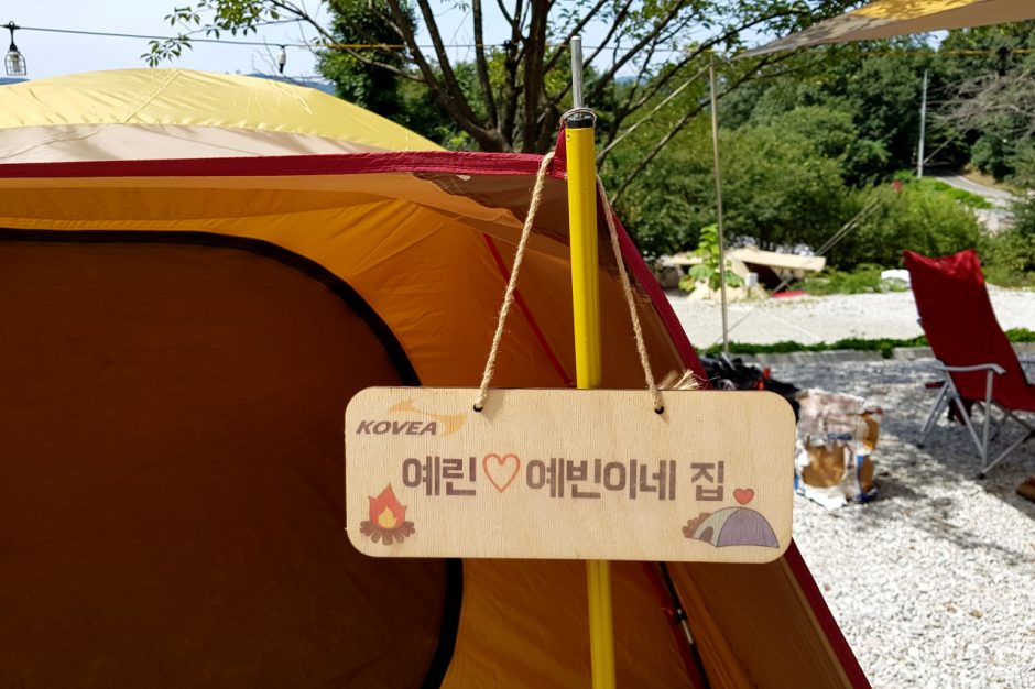 우리 가족들끼리만 온 캠핑이니까 당연히 명패는 ‘예린♡예빈이네 집’으로 걸었다.