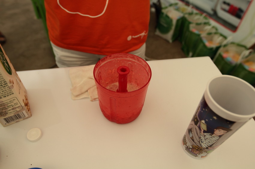 이벤트 선물로 받은 물병을 들고 또다른 이벤트 부스로 가니 터보차퍼로 쥬스를 만들어 주신다.