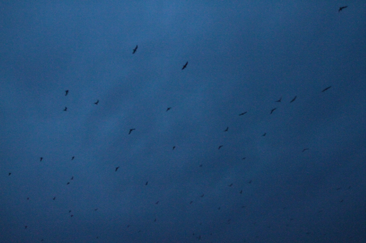 조금씩 어두워진 하늘에 갈매기 떼가 무리지어 날아간다.