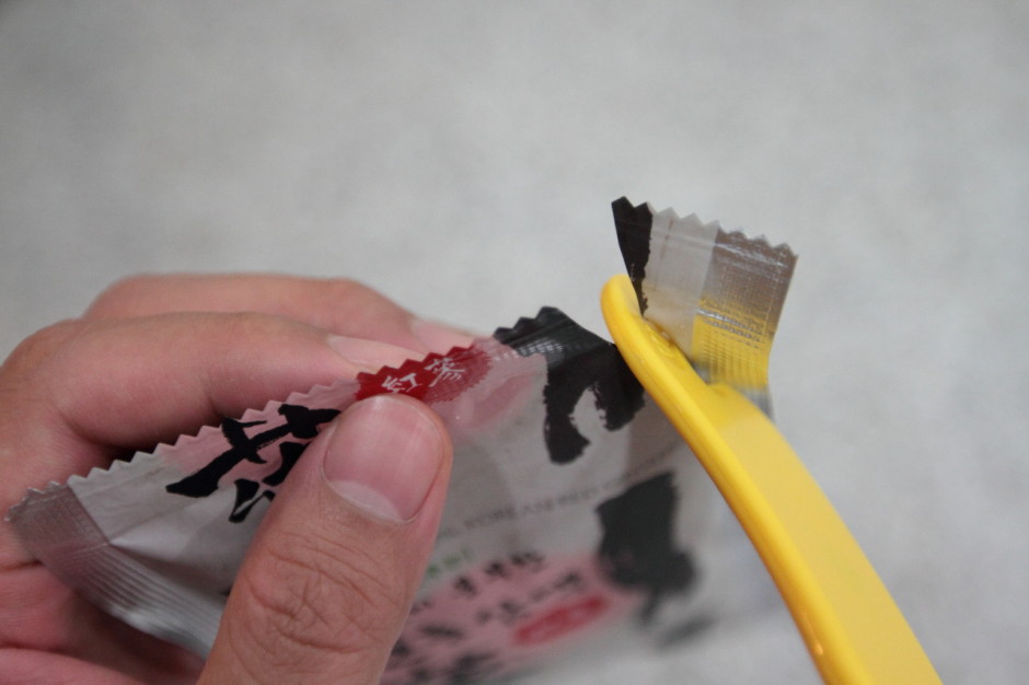 커터를 이용해서 홍삼액의 한 귀퉁이를 잘라준다.