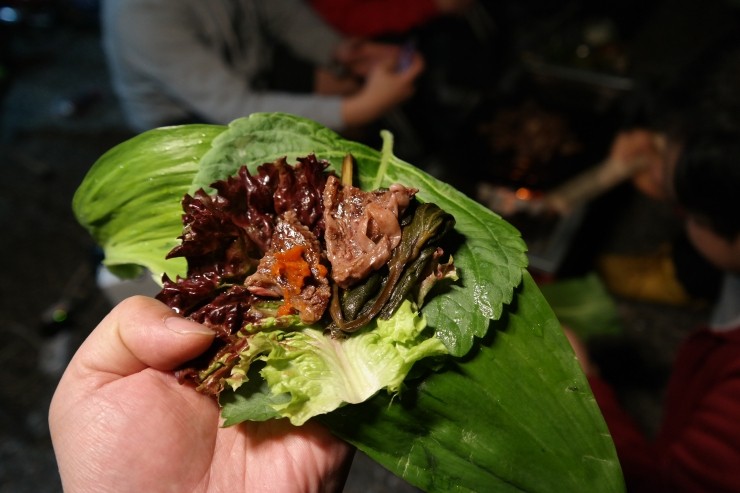 포도님이 준비해 오신 곰취에 브로멧님표 등심을 맛있게 얹어 사진을 찍으시는 릭소님.